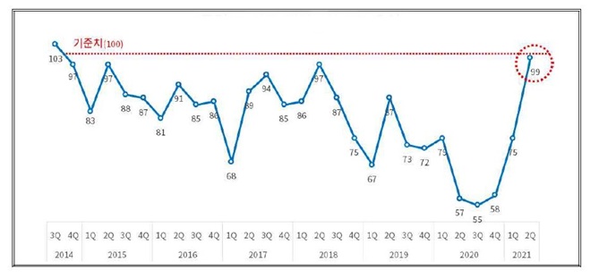 이는 2014년 3분기(103) 이래 6년 3분기 만에 가장 높은 수치다. 경기전망지수는 100 이상이면 '다음 분기의 경기를 지난 분기보다 긍정적으로 보는 기업이 많다'는 의미고 100 이하이면 그 반대다.