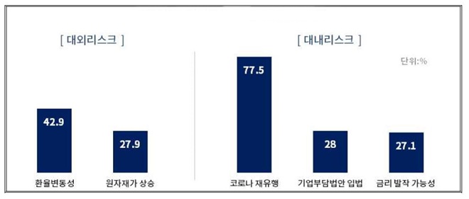 대내 리스크로는 코로나 재유행(77.5%), 기업부담법안 입법(28%), 미국 국채금리 상승에 따른 국내 금리 발작 가능성(27.1%), 가계부채 증가(12.6%) 등의 순으로 꼽았다.