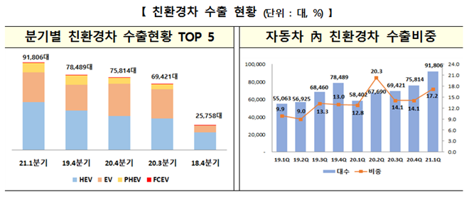 2021년도 1분기 친환경차 수출대수는 9.1만 대로 2019년의 7.8만 대 기록을 뛰어넘어 역대 최다 수출을 달성한 것으로 나타났다. 친환경차 수출액 비중은 전체 승용차 수출액의 19.5%를 차지했다.