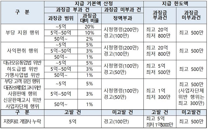 먼저 고발 건은 5억원으로, 미고발(경고) 건은 100만원으로 하고 증거·정보 수준의 최상-상-중-하에 따라 100-80-50-30%로 차등화했다.