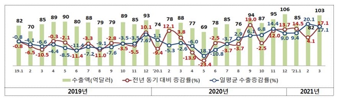 5개월 연속 수출 증가가 지속하고, 역대 1분기 수출 중 최고치 달성한 결과라고 전했다. 20대 품목 수출이 22.0% 증가하며 수출증가 견인됐고, 상위 5개 수출대상국으로의 수출이 14.1% 증가했다고 전했다.