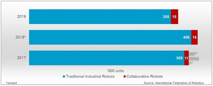 국제로봇연맹은 전 세계 인간과 로봇의 협업 현황도 분석했다. 산업용 로봇과 협동 로봇은 상이한 성장 그래프를 보이고 있는 것으로 나타났다. 보고서에 따르면 인간-로봇 협업 활용은 여전히 증가하고 있는 추세로, 산업용 로봇은 판매 대수가 줄어든 데 반해 협동 로봇은 2018년 1만6000대에서 2019년 1만8000대로 증가했다. 이러한 판매 수치는 2019년 기존 산업용 로봇의 전반적인 감소 추세와는 대조적이다.