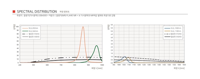 SLG-150V-NIR의 모델별 스펙트럼은 850nm, 940nm, 1060um, 1100um 총 4종류로 해당 파장에서 할로겐 150W 이상의 광량을 확보한다.
