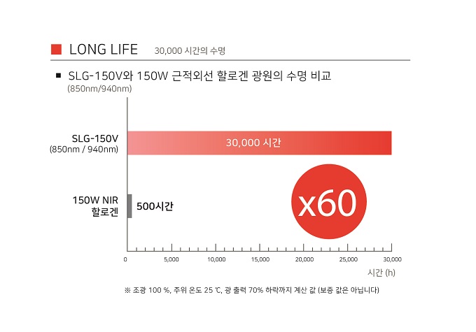 SLG-150V-NIR의 850nm, 940nm 모델의 경우 30,000시간으로 할로겐램프보다 60배 더 오래 사용 가능하기 때문에 하루 종일 사용할 경우에도 교체 없이 1,250일 동안 사용할 수 있다.