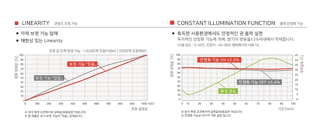 SLG-150V-NIR의 광량 제어는 256단계(8Bit), 1024단계(10Bit)로 미세 조정이 가능하다. 광량 제어할 때 자체 보정 기능이 동작해 광량이 균일하게 상승하고, 전원을 껐다 켜는 동작이나, 여러 차례 광량 변경을 하더라도 조광 단계에 따른 광량에는 변함없이 유지된다.