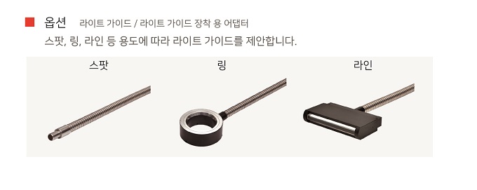 라이트 가이드 규격은 스미타, 하야시, 모리텍스와 호환되는 어댑터를 제공하며, 커스텀 제작도 가능하다. 사용 가능한 Fiber OF 직경은 φ8 ~ φ14mm이며, 스팟, 링, 라인형태의 라이트 가이드를 제공하기 때문에 대부분의 SOURCE 타입 광원과 동일한 사용 환경에서 사용할 수 있다.