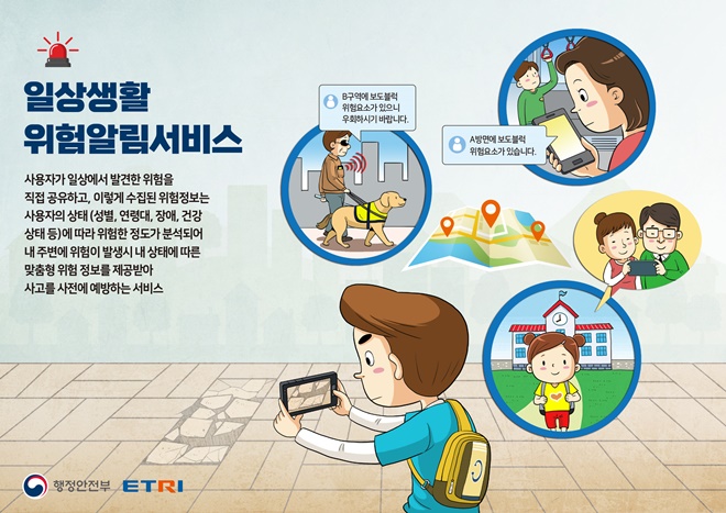 먼저 ETRI는 행정안전부 주관으로 보행, 치안, 보건, 환경, 시설 등 영역에서 일상생활 속 안전 위험을 예방하기 위해 '사용자 개인별 맞춤형으로 생활안전 위험 정보를 알려주는 서비스' 기술을 개발 중이다.