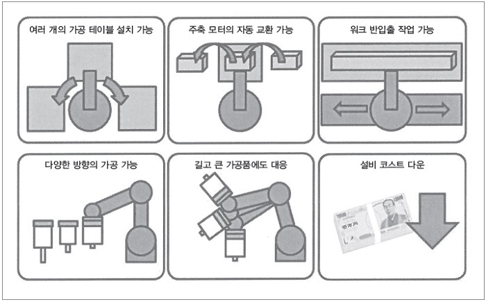 · 1대의 로봇 주위에 여러 개의 가공 테이블을 설치해 다품종 가공을 연속적으로 할 수 있다.
