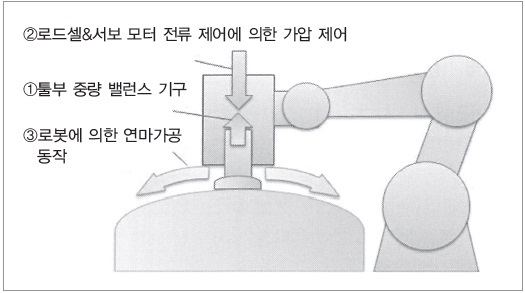 연마가공은 주로 작업자에 의한 작업이 일반적으로, 주로 그라인더를 사용하고 샌딩페이퍼나 연마제를 사용해 제품 표면을 균일하게 하는 작업을 한다. 그러나 그라인더는 진동을 동반하는 작업이며, 또한 균일한 평면으로 가공하기 위해서는 제품 형상에 따라 최적의 압착력을 유지하면서 적절한 동작이 요구된다. 또한, 고정도의 가공에는 숙련공의 기술이 요구되며, 더구나 진동이나 절삭칩에 의한 분진 환경 하의 작업이라는 어려움이 있다.