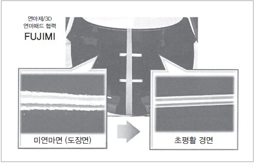 한편, 보다 정밀한 가공인 연마제(슬러리)를 이용한 경면 연마가공에서는 균일한 가압력 제어만으로는 어렵고, 연마패드나 연마제에 대한 지식과 적정한 제품의 제안도 중요하다. 이러한 과제에는 실리콘 웨이퍼나 반도체 디바이스용 연마 등에 대한 많은 노하우를 가지고 있으며 연마제를 제조 판매한 납입 실적이 많은 후지미인코포레이티드와 3차곡면의 경면 연마가공 기술 개발을 협업해 자동차의 본넷을 사용한 3차곡면의 도장면 경면 연마 테스트에서 양호한 결과를 얻었다(그림 7).