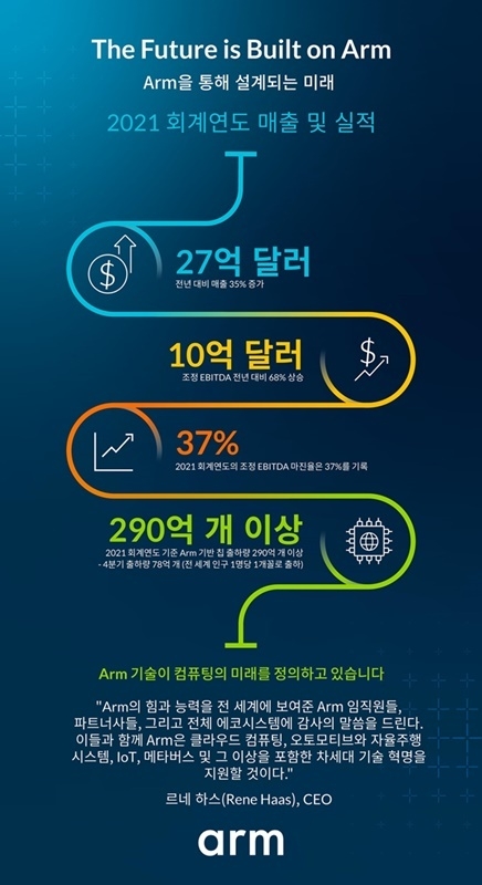 Arm의 2021년 총매출은 전년 대비 35% 증가한 27억 달러를 기록했으며, 로열티 및 비 로열티 수익 모두 크게 증가했다고 밝혔다.