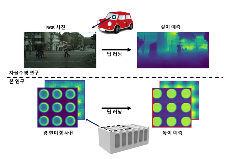 이에 연구팀은 비접촉 측정 방법인 광 현미경에서 딥러닝을 이용하여 원자현미경으로 얻어질 수 있는 나노 스케일 3D 표면을 예측했다. 비슷한 개념인 사진에서 깊이를 예측하는 기술은 자율주행을 위해 많이 연구되고 있는 분야다.
