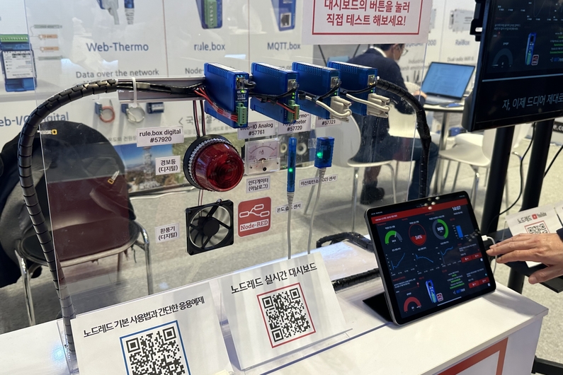 와이트리가 이번 전시회에서 공개한 제품은 노드레드이다. 노드레드로 작업장 온도 현황, 작업장 습도 현황, 작업장 이산화탄소 CO2 현황을 확인할 수 있다. 통합 측정 수치를 한번에 확인할 수 있고, 경보등 작동 여부나 환풍기 작동 여부도 확인할 수 있다.