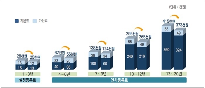 특허 수수료 중 발명가와 기업에 가장 부담이 컸던 특허 등록료를 최근 20년 만에 일괄 10% 인하함으로써 경제적 부담이 완화될 것으로 기대된다.