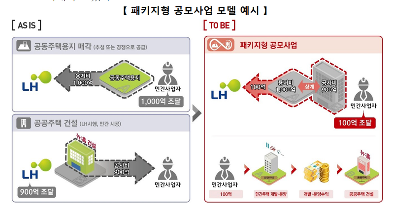 예를들면, LH가 1,000억원 규모의 민간 분양 공동주택 용지공급과 함께 900억원 규모의 공공주택 건설공사를 결합한 패키지형 공모사업으로 민간사업자와 계약을 하는 경우 민간사업자는 용지비(1,000억원)에서 공사비(900억) 차액인 100억원(1,000-900억원)만 납부하면 공동주택 용지를 즉시 공급받아 민간분양사업을 추진하고, 이후 민간분양사업을 통해 회수한 계약금과 중도금 등을 활용하여 LH의 공공주택 건설공사를 추진하는 것이다.