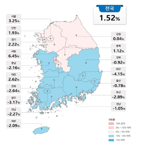 또한, 전반적인 시세 변동이 크지 않은 가운데 ‘24년 현실화율도 동결되어 시도별 공시가격은 지역별 부동산 시장 상황에 따른 상승․하락은 있으나, 전반적인 변동 폭은 크지 않은 것으로 나타났다.