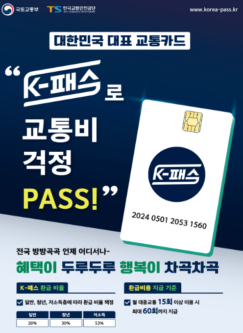 K-패스는 월 15회 이상 정기적으로 대중교통을 이용할 경우 지출 금액의 일정 비율(일반인 20%, 청년층 30%, 저소득층 53.3%)을 다음 달에 돌려받을 수 있는 교통카드이다. 이용 방법은 카드 발급과 회원가입만 거치면 된다. 10개 카드사의 누리집에서 K-패스 전용 카드를 발급받고, K-패스 공식 앱 또는 누리집에서 회원가입 시 카드번호를 등록하면 그 이후부터 탑승하는 대중교통 이용 실적에 따라 혜택을 받을 수 있다.