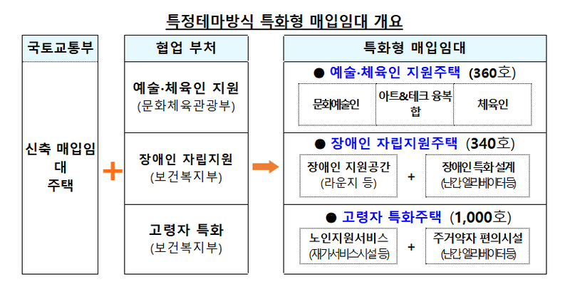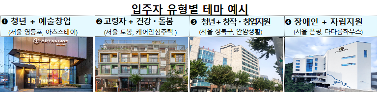 이번 공모는 예술·체육인 지원(문화체육관광부), 장애인 자립 지원(보건복지부), 고령자 특화(보건복지부) 테마가 제시된다. 각 부처는 지자체 등과 협업하여 테마별 입주 수요 등을 검토하였고, 실제 공급이 필요한 지역 위주로 공모를 추진할 예정이다.