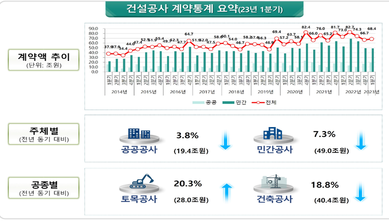 주체별로는 공공부문이 21.4조 원으로 전년 동기 대비 10.1% 증가한 반면, 민간 부문은 41.7조 원으로 전년 동기 대비 15.0% 감소했다. 공사 종류별로는 토목(산업 설비, 조경 포함)이 산업 설비가 감소하며 전년 동기 대비 14.4% 감소한 24.0조 원을, 건축은 3.3% 감소한 39.1조 원을 기록했다.