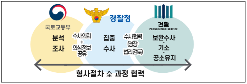 지정된 전세사기 전담검사는 '23년 1월경 이미 구축된 핫라인(hot-line)을 통해 수사 초기부터 국토부, 경찰청 등 유관기관과 긴밀히 소통하여 협력하는 등 단속과 수사의 효율성 제고를 위해 적극 노력하고 있다.