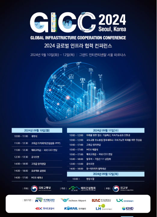 국토교통부가 주최하고 해외건설협회가 주관하는 '2024 글로벌 인프라 협력 콘퍼런스(GICC)'가 9월 10일부터 12일까지 서울에서 열린다.