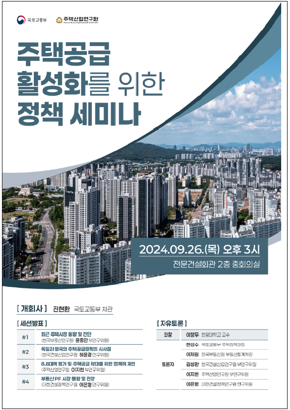국토교통부(장관 박상우)는 오는 9월 26일 오후 3시 서울 전문건설회관에서 '주택공급 활성화를 위한 정책 세미나'를 개최한다고 밝혔다.