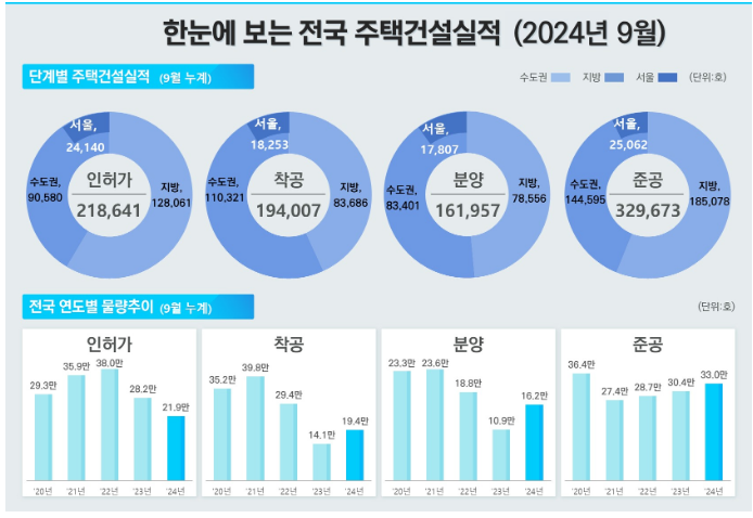 국토교통부는 2024년 9월 기준 주택 통계를 공표하였다. 건설 부문에서는 9월 착공, 분양, 준공이 모두 전년 대비 증가하였다. 인허가는 감소하였다. 인허가는 9월 기준 18,486호로 전년 동월(27,498호) 대비 32.8% 감소하였고, 1~9월 누계 기준 218,641호로 전년 동기(282,471호) 대비 22.6% 감소하였다.