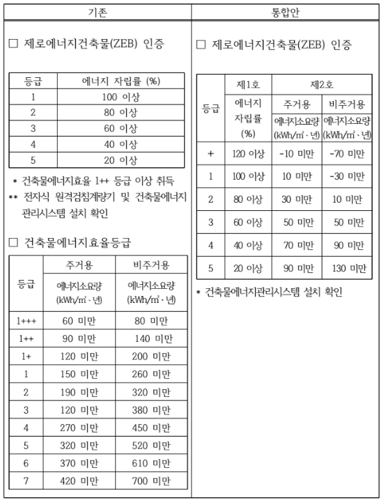 국토부는 '건축물 에너지효율등급제'를 '제로에너지건축물(ZEB) 인증제'로 통합 운영하기 위해 개정된 '녹색건축물 조성 지원법' 및 관련 하위법령*을 ’25년 1월 1일부터 시행한다. 그간 제로에너지건축물 인증을 받기 위해서는 건축물 에너지효율등급을 '1++' 등급 이상 취득하고, 다시 제로에너지건축물 인증을 신청해야 하는 불편함이 있었으나, 제도가 간소화됨에 따라 인증 신청자의 행정편의 제고, 인증 소요 시간 단축(80→60일) 등의 효과가 있을 것으로 기대된다. 아울러, 공공건축물 신축 시 취득해야 하는 제로에너지건축물 최저 인증 등급도 상향(5등급→4등급)하는 등 공공부문이 선도하여 건물 부문 탄소중립 목표 달성에 박차를 가할 계획이다.