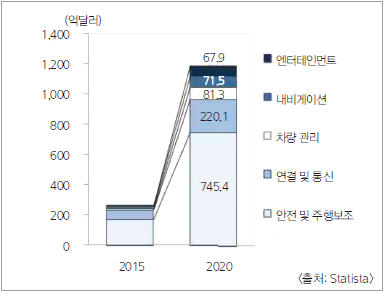 세계 커넥티드카 시장은 2015년 263억 2천만달러에서 2020년 1,186억 2천만달러로 연평균 35.1% 성장할 전망이다. 2020년 기준 부문별로 안전 및 주행보조 기능이 745억 4천만달러로 전체 커넥티드카 시장의 62.8%를 차지할 전망이며, 그 다음으로 연결 및 통신(220억 천만달러), 차량관리(81억 3천만달러), 내비게이션(71억 5천만달러) 순이다. 한편, IoT로 연결되는 차량 수는 같은 기간 2,200만대에서 1억 6,030만대로 8배 가까이 증가할 것으로 예상된다.