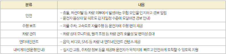 커넥티드카가 제공하는 안전 기능으로는 충돌, 운전자 피로 누적 등 차량 내외부의 위험 요인을 감지하여 경보 알림 서비스 등이 있다. 주행보조는 자율 주차, 고속도로 자율 주행 등 일부 특정 상황에서 운전자에 주행편의를 제공하는 기능으로, 글로벌 주요 자동차 제조사 간 개발 경쟁이 가속화되면서 향후 수년 내 빠르게 성장할 것으로 기대되는 분야다. 기타 차량관리, 차량 내 엔터테인먼트, 내비게이션 기능 등이 동반 성장이 전망된다(표 10).